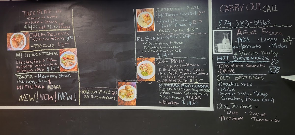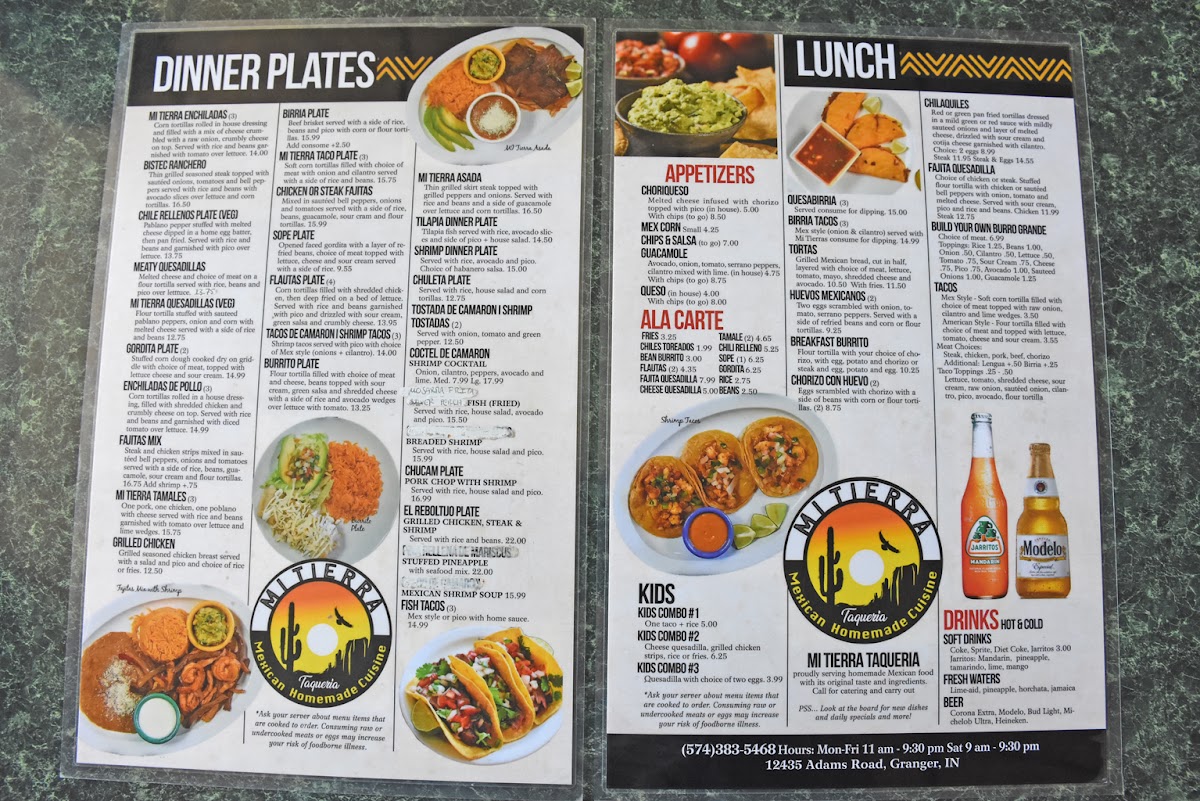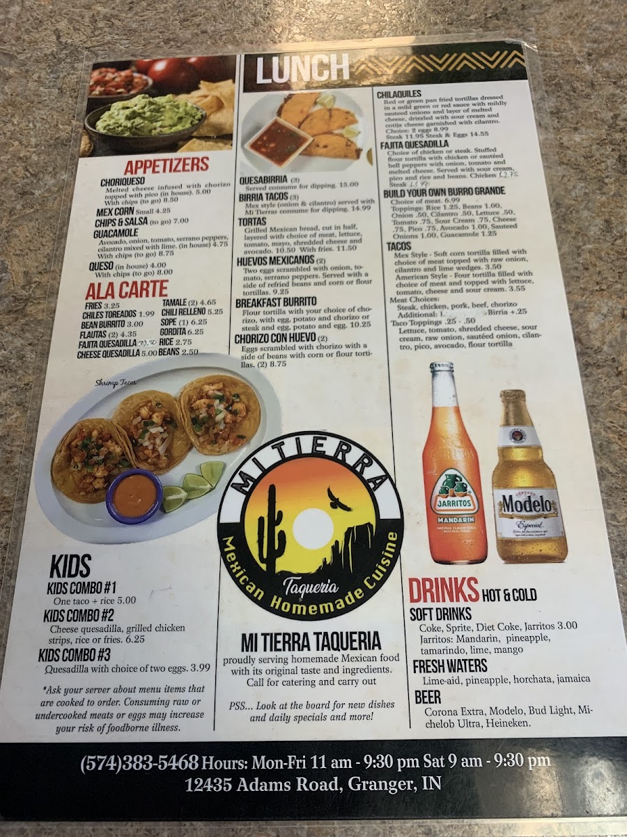 3 Tacos choice of Steak, Pork or Chicken, Chorizo, Ground beef, With onion & cilantro served with a side of Mi tierra Beans & Rice. Additional topings .25 cents
